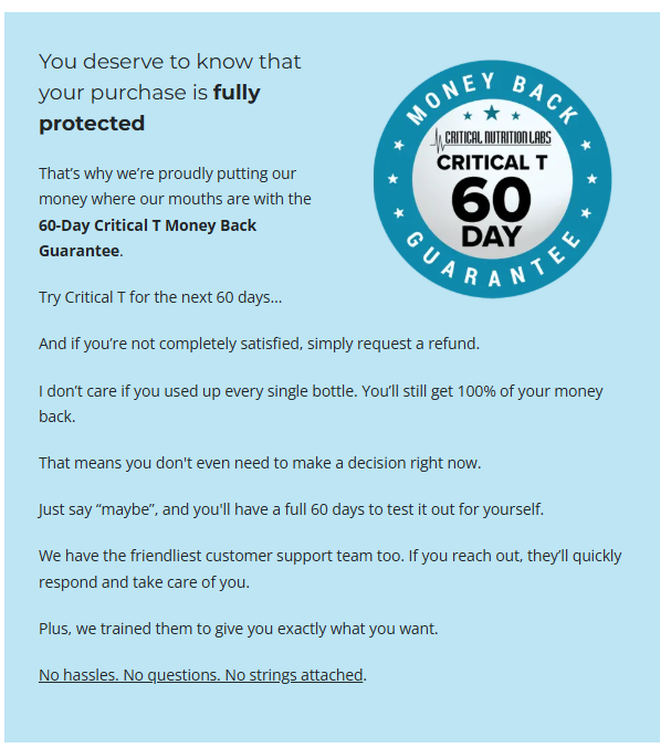 Many sellers offer refunds or guarantees, but this depends on where you purchase Critical T. Always check the return policy before buying.