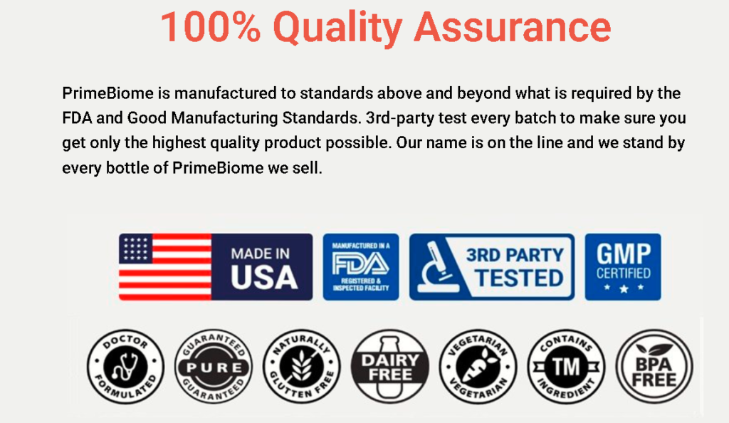 Prime Biome is manufactured to standards above and beyond what is required by the FDA and Good Manufacturing Standards. 3rd-party test every batch to make sure you get only the highest quality product possible. Our name is on the line and we stand by every bottle of Prime Biome we sell.
