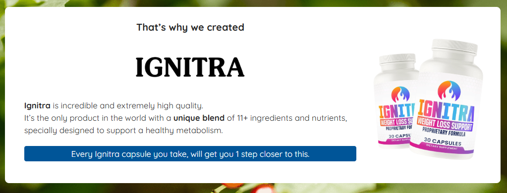 Ignitra is marketed as a natural weight loss supplement designed to support your body’s metabolism and promote fat burning. According to the manufacturers, Ignitra works by targeting the underlying causes that often make weight loss difficult, such as slow metabolism and excess fat storage. The formula reportedly contains a blend of carefully selected ingredients—such as natural plant extracts, antioxidants, and metabolism-boosting compounds—that work synergistically to enhance energy levels, curb appetite, and increase the body’s ability to burn fat more efficiently.