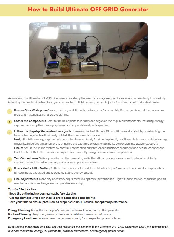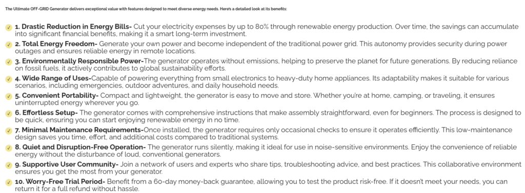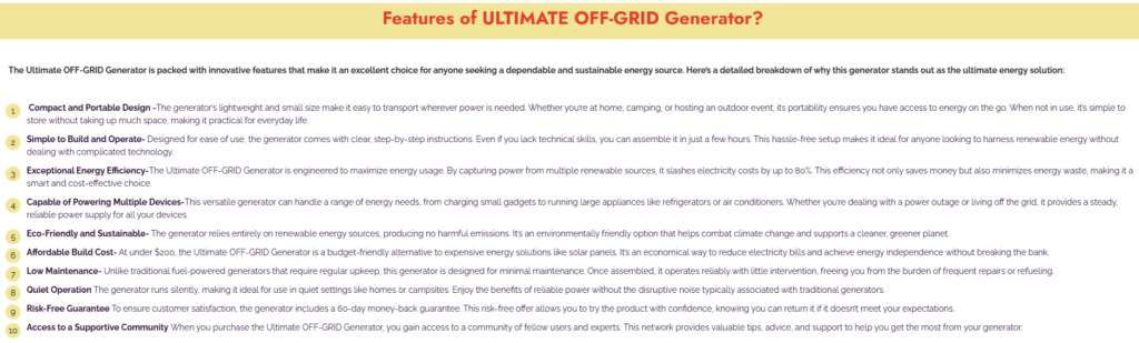 The Ultimate OFF-GRID Generator boasts an impressive array of features designed for off-grid enthusiasts. It typically includes a robust power output, often rated at 3000 to 5000 watts, allowing it to handle various appliances with ease.